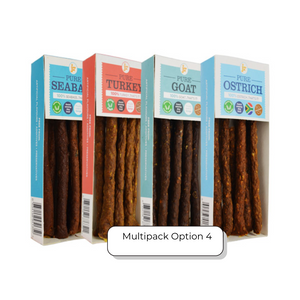Treat your dog to a world of flavours with the JR Pet Products Pure Meat Sticks Variety Packs. Made from 100% prime cuts of fresh meat or fish, each stick contains nothing but natural goodness – no additives, no preservatives, no grains, and no gluten.